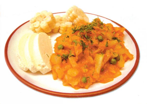 colorante, seguir sofriendo, por último agregar el caldo, dejar cocer hasta que reduzca a la mitad el líquido. Mover continuamente mientras se echa el lacayote, las arvejas, las habas, la papa, la sal. Mezclar.