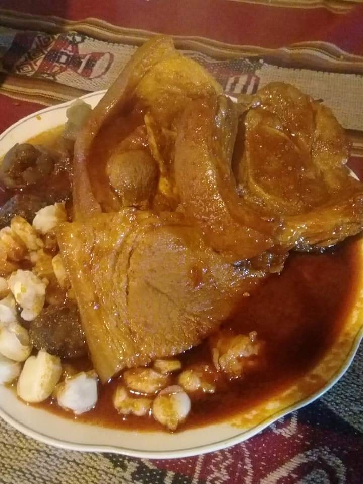 Primeramente filetear la carne y salpimentar la misma, Machucar con ayuda de un moroco (piedra de forma redonda) el pan molido con la carne y fritarlos en aceite caliente.Por otro lafo licuar los ajis en vaina, picar la cebolla y el pimenton en brunoise y llevarlas a sofreir con la zanahoria cortada en bastones vertir el aji licuado y un chorro de aceite, cuando empieze a cocer el guiso vaciar las habas y arvejas peladas y la carne ya frita dar un hervor y aguardar hasta el momento de servir... BUEN PROVECHO!!!
